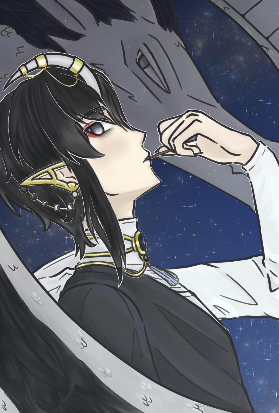 ☽ There was a point in his life where he lived in the Far East. At first he was mistaken for an Uwabami due to his insatiable hunger towards freshly harvested eyes and flesh. He wasn't a spirit, so Omnyoji and other practitioners of the spiritual were unable to do anything about him. Attempting to kill him was difficult and he constantly fled quicker than they can catch him. They eventually tricked him and locked him into a cave using freshly hunted carcasses.✩ While trapped by the village, his more draconic nature got the better of him and he'd have fits of rage from within the cave. Scared the seal might break, the village started sacrificing corpses to what they thought was a malevolent spirit. Lahò's more 'humane' side was sickened by this, but his dragon side and embedded nature as a bioengineered weapon of war outweighed the other. He survived trapped in the cave by eating the sacrifices by the villagers.☽ Eventually through the years the village was abandoned and Lahò was forgotten. During this time he lived eating dirt, stone, leftover bones, and whatever else he could get any form of aether from in the darkness. Out of necessity, he learned how to 'eat' away at the aether used to ward the cave causing it to weaken over the years.