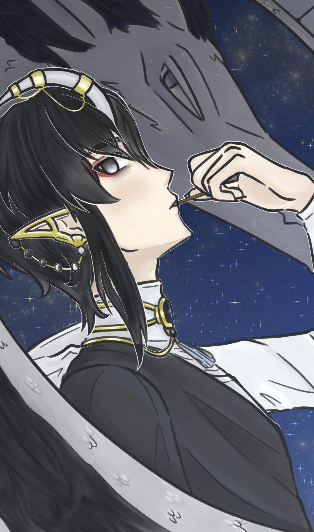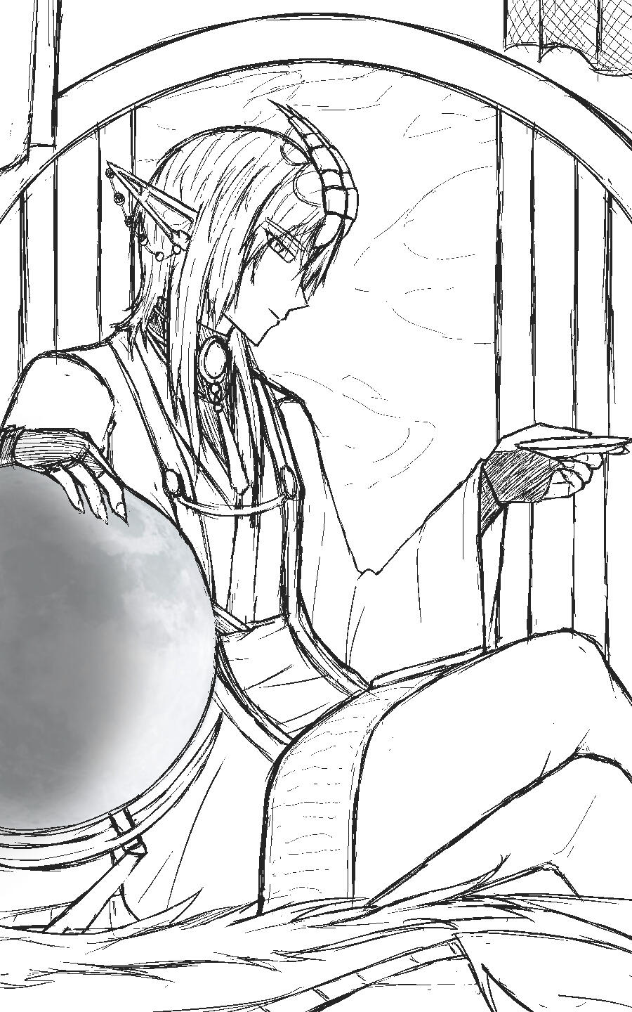 Standing at 6 fulms 8 ilms, the average height of Elezen men, Lahò has a muscular ectomorphic build. His skin is pale with a cool gray tinge and there are noticeable dark circles under his eyes. The majority of his irises are covered in a dull, dark, foggy like color. The irises of his eyes that can be seen towards the bottom are a glowing silvery white. One might say it's like gazing towards a bright full moon being swallowed by a dark cloud.His usual attire is that of loose thick silks of various monochrome tints. A good eye might spot a shimmering snake scale like pattern on the white sash between the two darker ones. When caught without his hood and eye cover, one can see golden ear clamps on his pointy ears decorated with white pearls that have been clouded in various patterns similar to that of the patterns of an eclipse. Much of his clothing itself appears to have eclipse and serpentine motifs sprinkled throughout. Laho is almost never seen without something covering his head to hide his horns.